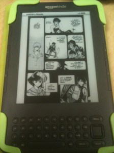Reading manga scanlations is shockingly easy too. You can put a folder of jpg files or even a .cbz file into the documents folder and it’ll read them more or less fine. (When it first starts up it sometimes fails to render part of the right-hand side of the image, but fiddling with the back and forward buttons fixes that.) The resolution is just about right for the big and breezy panel pacing of manga, and I would be worried about how well it’d work with more compact Western comics (or anything by Ken Akamatsu or Masamune Shirrow for that matter). There is a simple program called Mangle that can take files and put them into a numbered folder to make sure they show up on the Kindle and get displayed in the correct order, which seems to help a lot.
