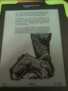 The PDF reader works very well as long as the pages are small enough to fit on the Kindle’s screen. The above image is of Ben Lehman’s latest game, On the Ecology of the Mud Dragon, and as you can see its small pages (5.5×8.5″), relatively large text, and simple monochrome art look awesome on a Kindle screen. Things get more difficult with larger page sizes and smaller type, and I found the PDFs of Blowback and FreeMarket all but unreadable. You can zoom in and pan around, but it’s probably the single most cumbersome aspect of using a Kindle. It is possible to convert a PDF to a .mobi file to read as an e-book with programs like Calibre, but I suspect an RPG is exactly the kind of thing what could trip it up and become difficult to read.