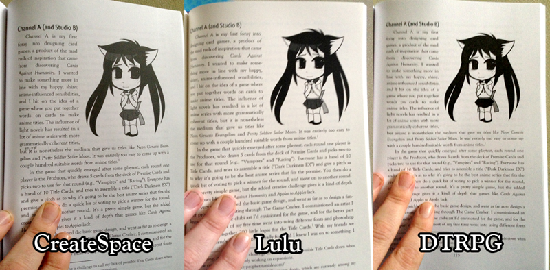 From when I ordered it to when I got it, the proof from DTRPG took about a full week to arrive. I was happy with the quality of the printing, though the paper and the cardstock of the cover were thinner than either CreateSpace or Lulu. Not a deal-breaker, but not what I would’ve gone for myself. As you can see in the photo below the cover of the DTRPG one was even brighter than the CreateSpace one, and the Lulu version still looks just awful. The interiors are pretty comparable, though the pictures look a little faded in the CS one and the Lulu one has that cream-colored paper.