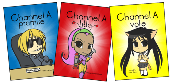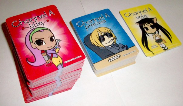 I have enough leftover ideas for Title Cards to get a good start on a third expansion, plus I have an idea for an expansion called “Japanimation Fever” or some such aimed at the style of anime parodies as done by people who know text to nothing about anime,[2] but I’m mostly shelving Channel A so I can get other stuff done.