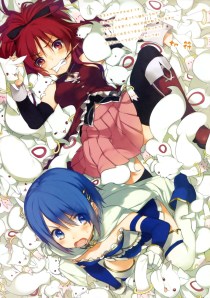 I just finished re-reading Planet Guardian, a manga which hardly anyone but me seems to know. (Even scanlations haven’t gotten past chapter 2.) It doesn’t have all that much influence on Magical Burst, but I like it a lot nonetheless. The main character is Koyuki Kisaragi, a girl who got magical girl powers from a little critter named Pirosuke. Five years later there’s been no sign of the alien criminals that were supposed to show up, and Koyuki just wants to study hard and get a cushy government job (and Pirosuke has gotten so fat that he’s spherical). When the first bad guy shows up, Koyuki goes to fight it only after massive badgering from her brother Itsuki, who berates her for failing to be a properly cute magical girl like in anime. When another magical girl shows up it’s Ririka Saotome (real name: Yoshiko Yamada), an abject psycho whose desire to be the center of attention is potent enough to break the fourth wall at times. There’s also a boy named Shizuku, who treats being a Guardian as a serious duty, at least once he gets over his older sister’s attempts to dress him up in weird outfits. The story is kind of random and aimless, but I really like the differing attitudes towards being a magical girl (or boy) on display, as well as how Koyuki’s attitude evolves over the course of the story as she starts to take the responsibility of protecting the world seriously. But anyway. I may see about ordering the Madoka Magica novel, though it’s apparently over 500 pages.