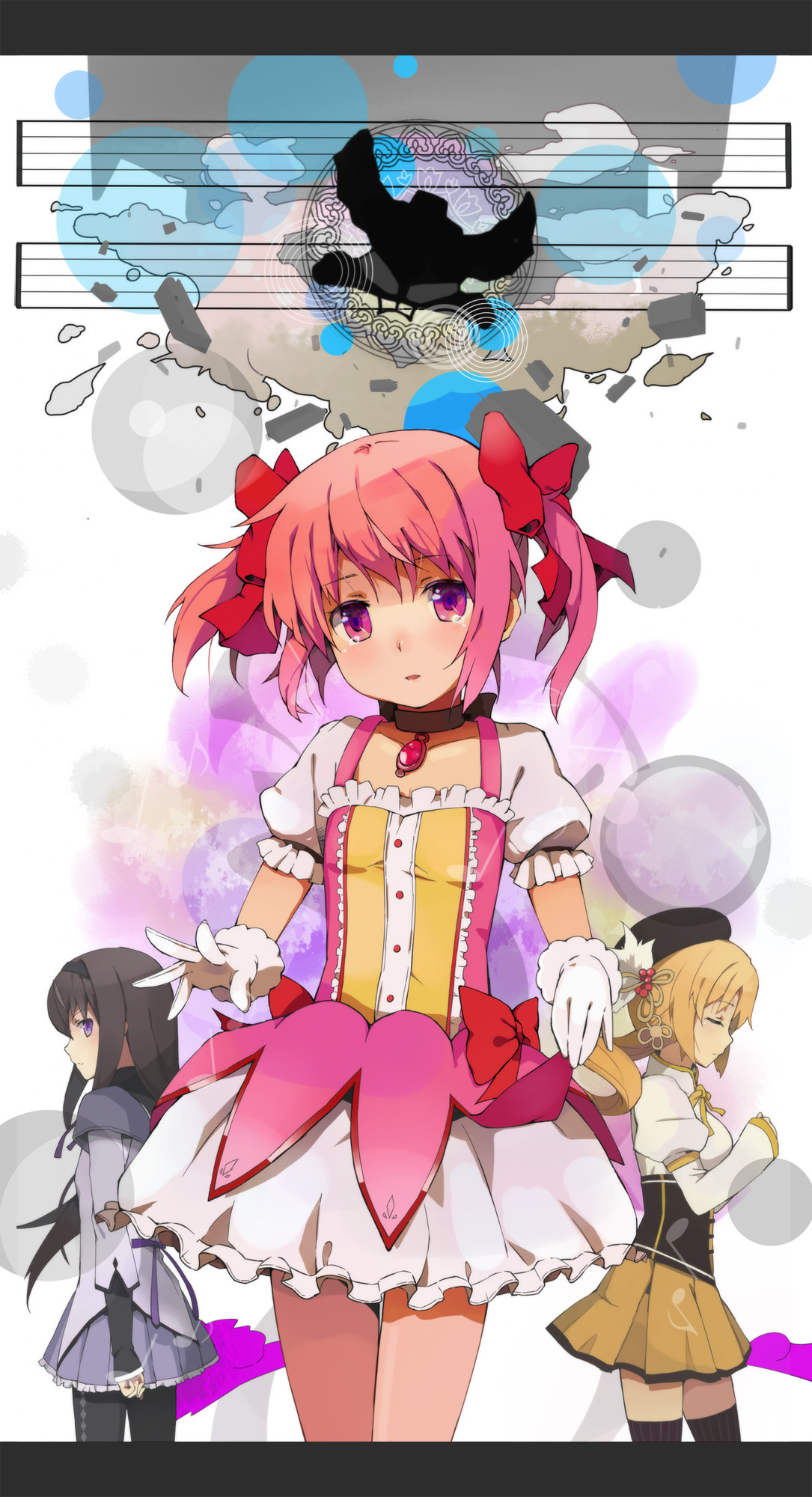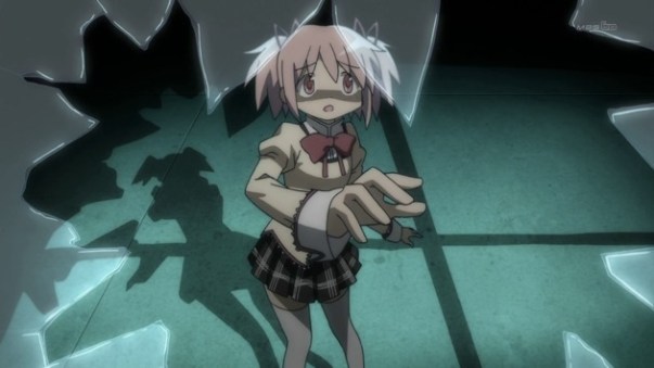 What has me so incredibly inspired is a new anime series called Puella Magi Madoka Magica. It’s a magical girl series from Akiyuki Shinbo, the prolific anime director known for series like Hidamari Sketch, Sayounara Zetsubou-sensei, and many others. (It also doesn’t hurt that the character designs are by Ume Aoki and the music by Yuki Kajiura.) Lyrical Nanoha challenged some of the conventions of magical girl anime–such as by having the protagonist actually sit down and talk to her mother about what she’s doing–but Madoka Magica is the dark magical girl series I’ve been wanting for a long time. It is a series where death is a very real danger, where the desires of adolescent girls are dangerously magnified by magic, and where the forces they’ve aligned themselves with are not so benevolent as they might seem.